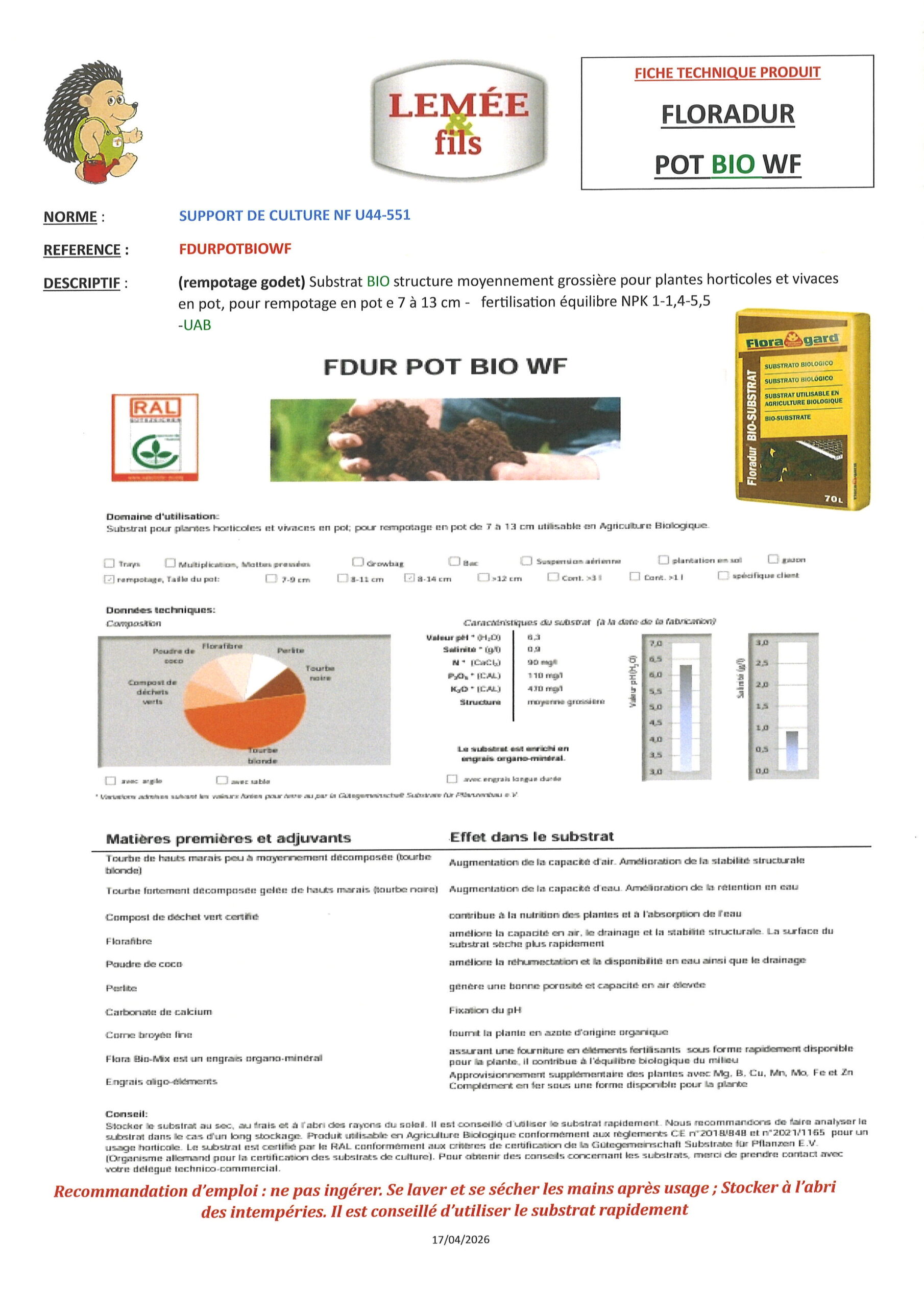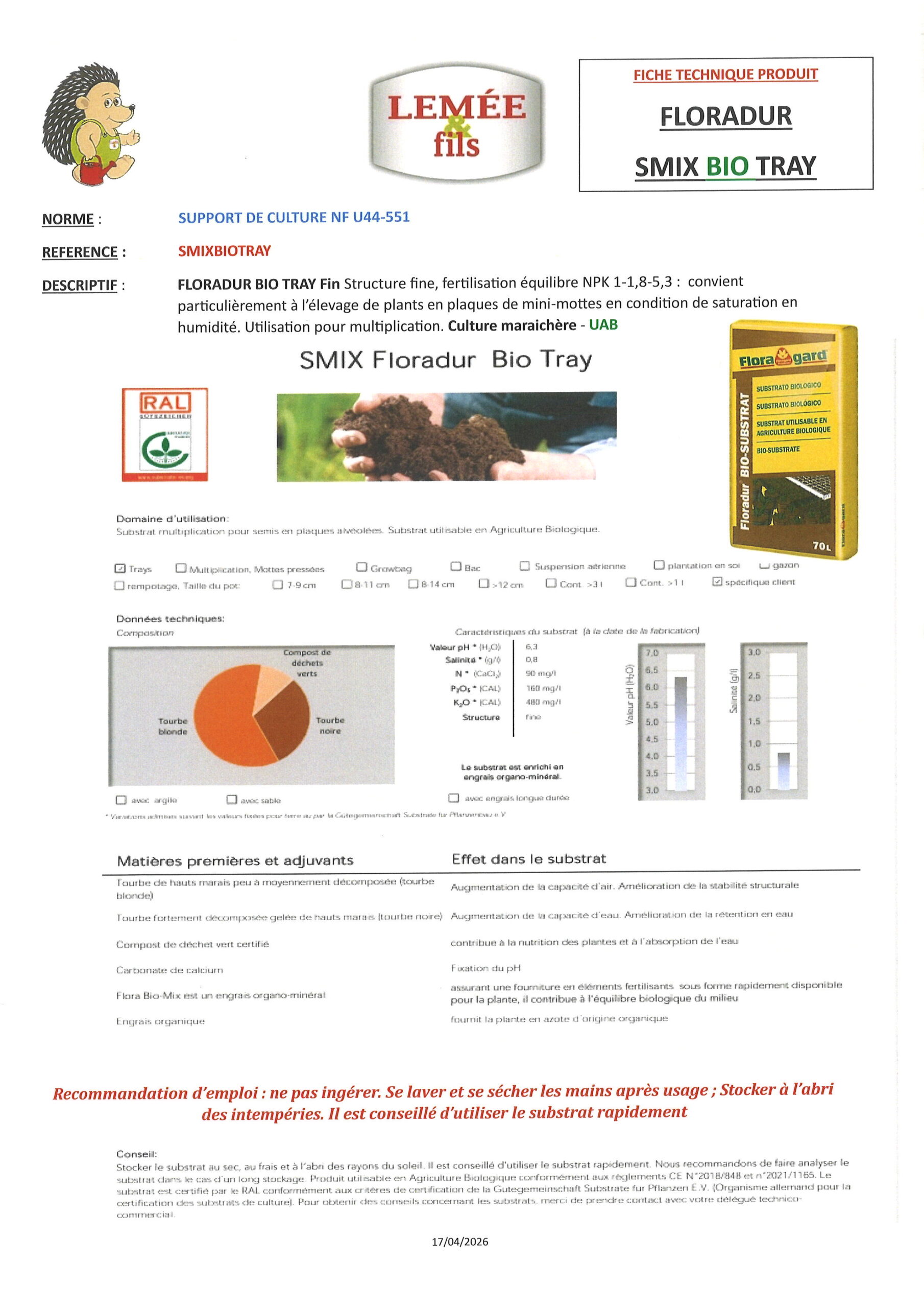 Recommandation d’emploi : ne pas ingérer. Se laver et se sécher les mains après usage ; Stocker à l’abri des intempéries. Il est conseillé d’utiliser le substrat rapidement